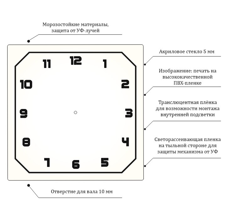 Изготовлен из акрилового стекла толщиной 5 мм с прочным корпусом для уличной эксплуатации. Размеры циферблата: 87 × 87 см, оптимально подходит для крупных уличных инсталляций.